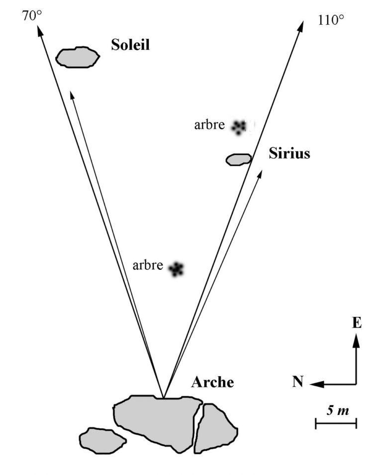 Vue depuis le point d’observation de l’arche, la direction géographique exacte des extrémités des rochers est de 74° (Soleil) et 110° (Sirius). Ces directions coïncident assez exactement avec la direction d’apparition du Soleil (71°) et de Sirius (107°), à l’époque de l’année de leurs levers presque simultanés (lever héliaque).